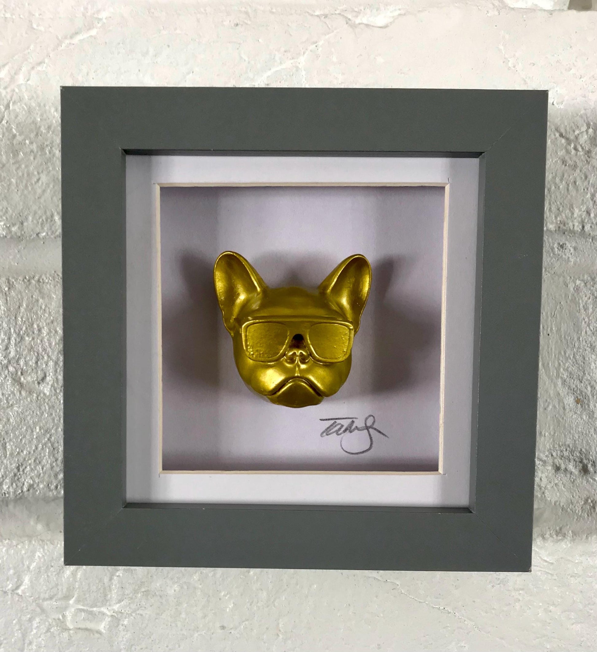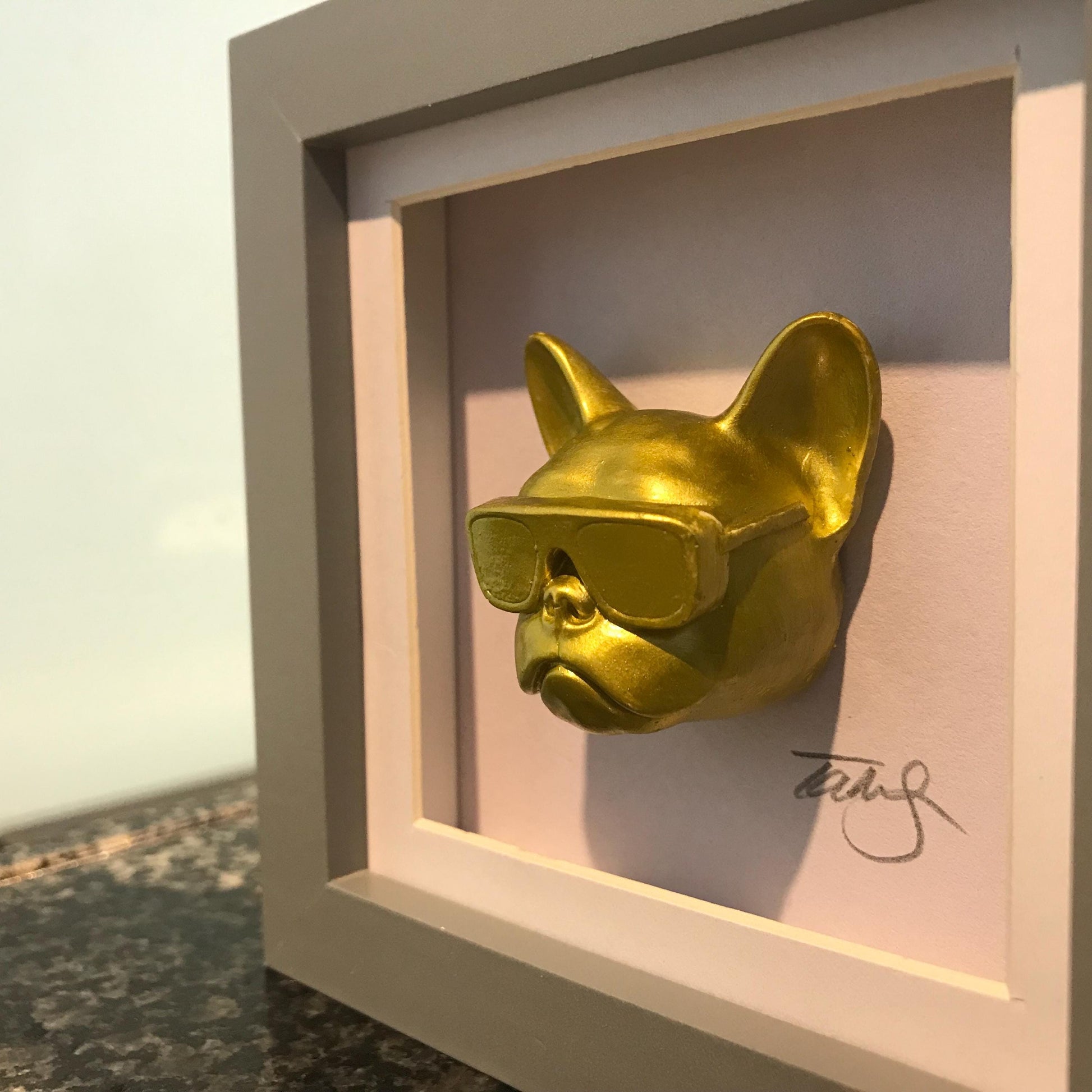 Meet the coolest Frenchie on the block. This original piece features a French bulldog sculpture in Gold complete with shades—because why not? It’s full of character, made entirely by hand in my home studio, and set in a 10x10cm box frame.