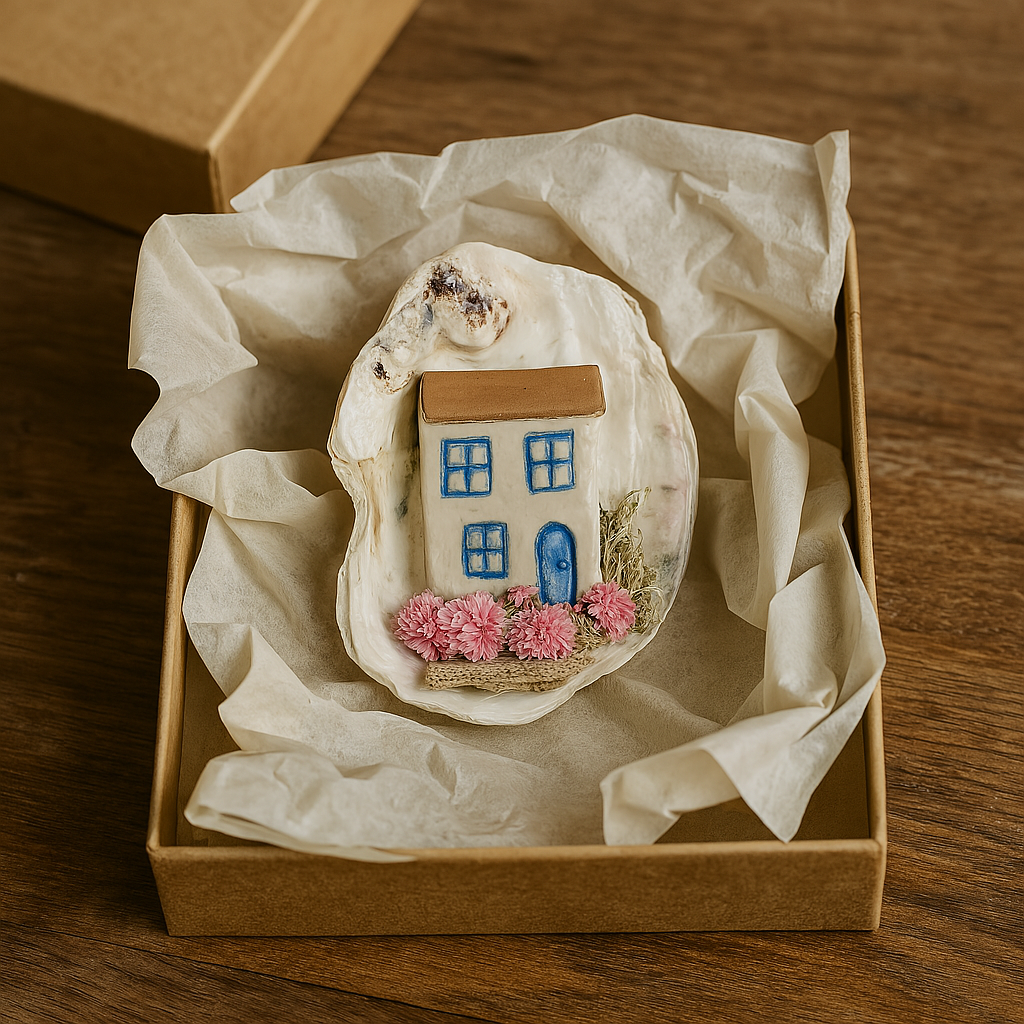 These tiny worlds are sculpted by hand and nestled inside real oyster shells, each one gathered locally and naturally weathered for a beautifully raw finish. The cottages are crafted from clay and set within miniature gardens made from driftwood, moss, and dried flowers — collected from countryside walks and woodland finds.