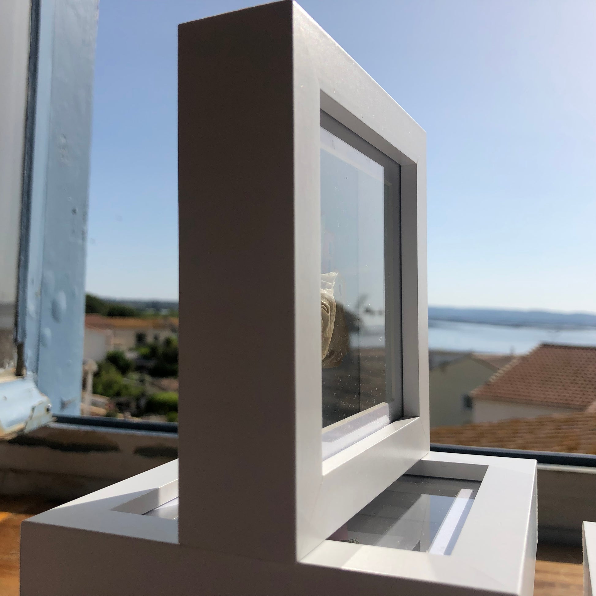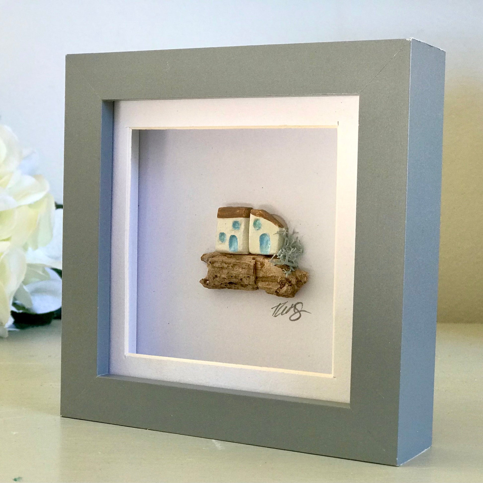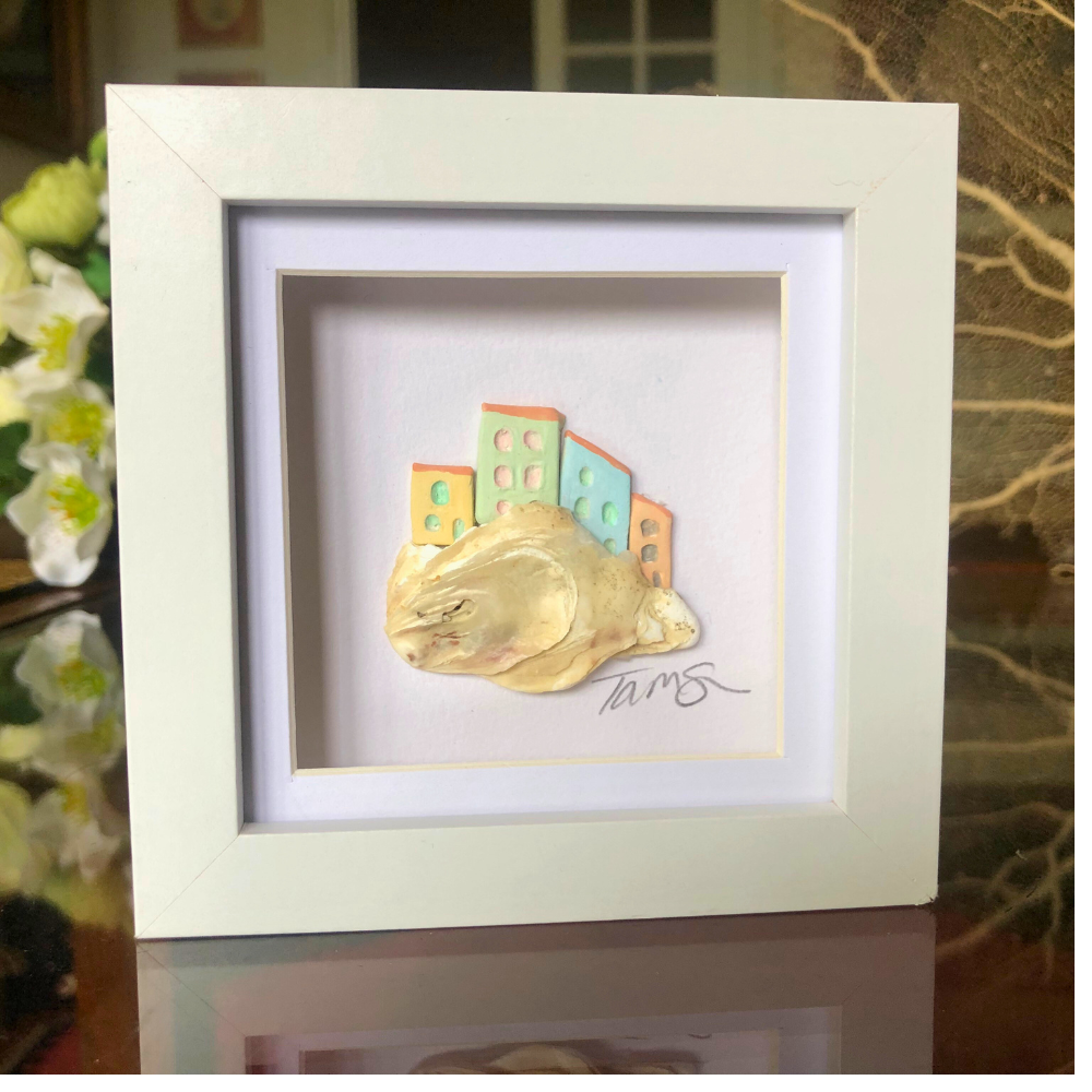 Each one is hand-sculpted in clay and set on a piece of driftwood collected from nearby shores, then framed to hold the moment in place.