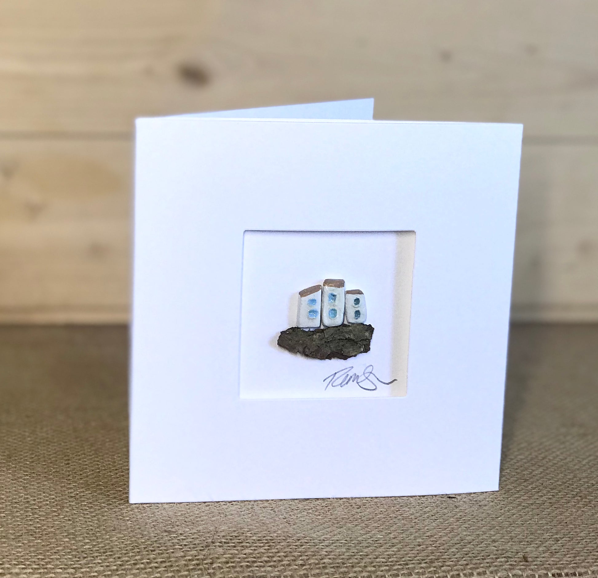Each one is hand-sculpted in clay, set on a piece of local driftwood, and framed within a 13.5 x 13.5 cm aperture card. These aren’t just greetings—they’re miniature villages, folded into cards. No two are ever the same, each made individually in my studio.